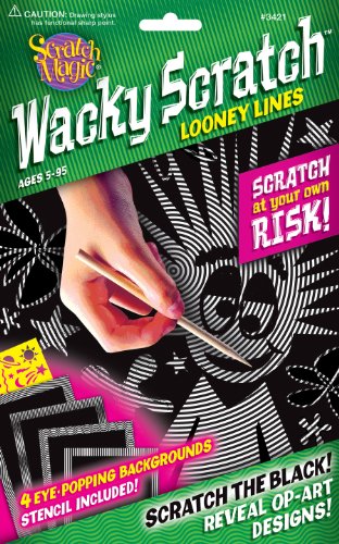 Draw the wackiest craziest pictures you've ever seen! Use the wood s tylus to scratch and reveal designs that will pop off the page! Use t he stencil to jump start your art or invent your own. Encourages creat ivity sharpens thinking skills and is just plain fun! Kit includes 4 assorted Wacky Scratch drawing boards 1 wood drawing stylus 1 Wacky stencil with over 30 amazing shapes and instructions.