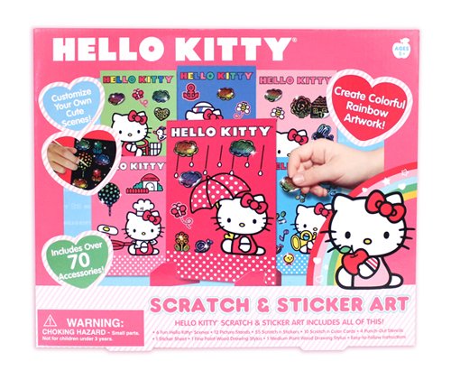 Customize Your Own Cute Scenes with the Hello Kitty Scratch and Sticker Art Set! Create Colorful Rainbow Artwork!The Hello Kitty Scratch and Sticker Art Set includes:6 Fun Hello Kitty Scenes6 Picture Stands55 Scratch N Stickers10 Scratch N Color Cards4 Punch-Out Stencils1 Sticker Sheet1 Fine Point Wood Drawing Stylus1 Medium Point Wood Drawing StylusEasy-to-Follow Instructions