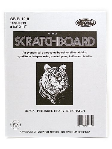 Scratchboards are coated with a fine white china clay and coated with an opaque black ink. Dramatic black and white drawings can be created by scratching through the black coating to expose the white clay surface beneath. A scratchknife or other metal scratch tool (available separately) produces lines, textures, etc. Economical high quality student grade scratchboard. Safe, clean and non-toxic. Instructions included. 8-1/2" x 11" Pack of 10.