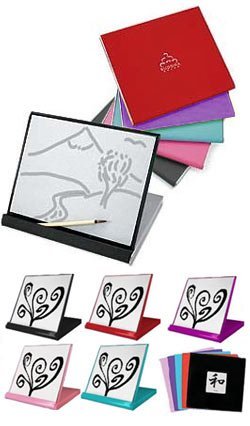 Mini Buddha Board (Gift Card) One of this season's hottest gifts! Buddha Board Gift Card is based on the Zen concept of living in the moment. You simply paint on the surface with water and your creation will come to life in bold design. Then, as the water slowly evaporates, your art will magically disappear leaving you with a clean slate and a clear mind - ready to create a whole new masterpiece. Buddha Board is also environmentally friendly and will last for years with proper care. Allow yourself to 'let go' and not be concerned with each outcome - live for the moment and enjoy! The elegantly packaged 5-inch square Buddha Board incorporates the "magic" painting surface and folds back onto its own small easel stand. It comes with a brush and ten special-occaison stickers (for birthdays, peace, romance, Christmas, tranquility, joy and more) that sender can apply to personalize the cover. Made of thick plastic with a gloss finish, it is offered in five colors, comes with its own painting brush and is accompanied by an elegant black envelope.