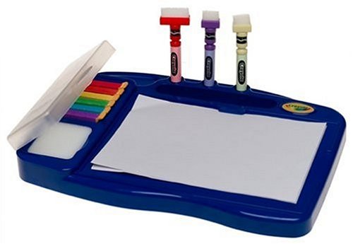 Painting with water colors is usually a messy activity but this compact kit keeps all components contained for a more spill-free painting method that is even easy to bring on the road. The right side of the plastic tray houses a row of nicely balanced crescent-shaped watercolors and a well that, instead of holding sloshing water, contains a neat damp sponge. A tightly closing hard plastic case stores paint, sponges, and brushes during travel. Shaped like crayons, the three brushes in this kit feature innovative and interchangeable sponge tips that, when used with the crescent-shaped paints, can make unique multi-colored rainbow paintings. Brushes stand straight up in the tray to avoid marking tabletops or works in progress. The tray's clipboard holds a sheet of 8-1/2-by-5-1/2-inch paper, which serves as a palette for designs. The kit includes a plastic tray, six paints, three brush holders, six foam brushes in varying sizes, a sponge, and five sheets of paper. These watercolors are not the washable kind so it is advisable that kids wear a smock. --Cristina Vaamonde
