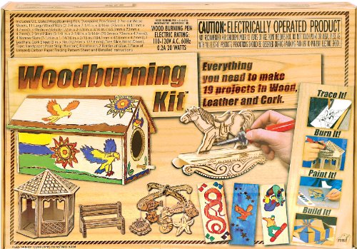 A classic craft for boys and girls, NSI brings you the most complete woodburning kit available. You can make cool leather bracelets, cork board, wood boxes, birdhouses, mobiles and much more. Let your creativity soar as you explore this cool and unique art form. Includes U.L. listed woodburning pen with stand, overpoint natural tree slice, 3-D projects, leather, wood, cork, paint, brush, foil, sandpaper, glue, new patterns and instruction book.